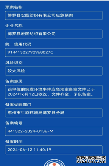 已制訂《博羅縣宏圖紡織有限公司突發(fā)環(huán)境事件應急預案》,并于2017年 10月25日在博羅縣環(huán)境保護局備案, 備案編號:2017-35 ,2021年和2024年在惠州市生態(tài)環(huán)境局博羅分局進行再次備案 |