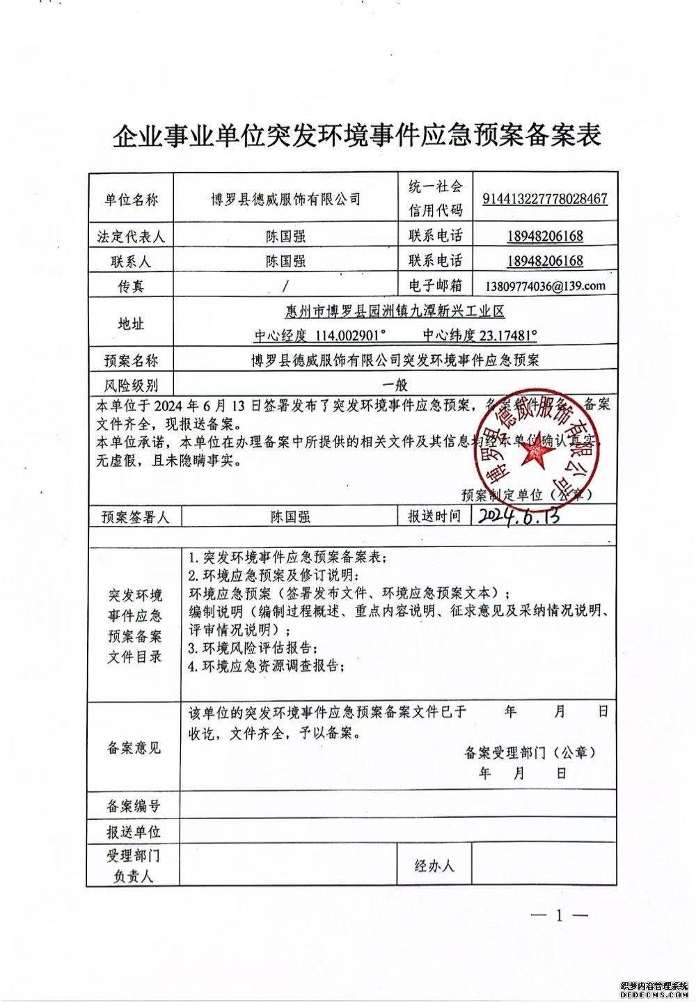 附件鏈接:《博羅縣德威服飾有限公司突發(fā)環(huán)境事件應急預案備案登記表》 |