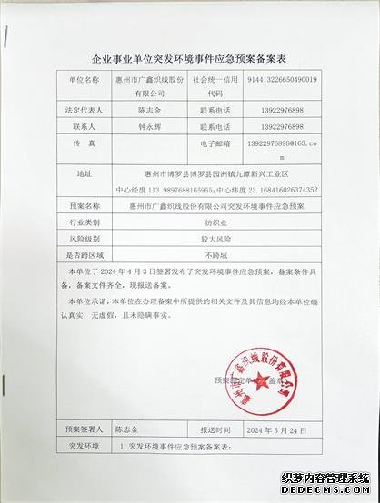 | 應急預案備案函 | 惠州市廣鑫織線股份有限公司突發(fā)環(huán)境事件應急預案 | 惠州市生態(tài)環(huán)境局博羅分局 | 441322-2024-0100-M | 需要者依申請?zhí)峁⿸呙杓?/span> |